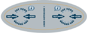 The Status Label wraps across the front edge of a new notebook, holding it shut. The words Tap Here appear on the front and back covers.