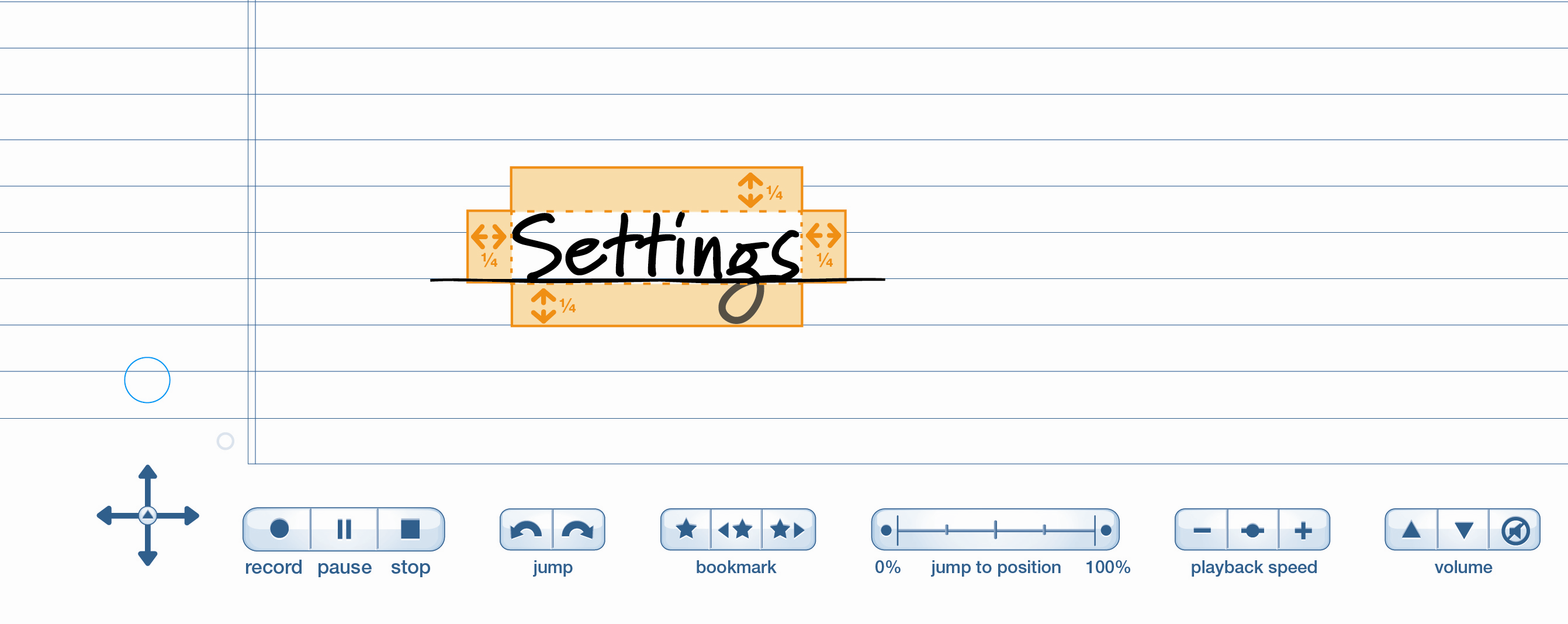 After you write a Launch Line and shortcut word, you can tap up, down , left, or right around the Launch Line word to access menus of the Connect smartpen app. The active areas for up, down, left, and right are invisible rectangles extending 1/4" outward from the shortcut word in the four directions. In the illustration, the shortcut word is Settings, which launches the smartpen's Settings app. With Livescribe Connect, your shortcut word will be Send, Connect, Email, Computer, MyLivescribe, etc.