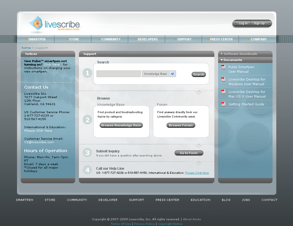 From the Livescribe Support site, you can search and browse the Livescribe Knowledge Base. There you can find answers to many of your questions. Livescribe updates the knowledge base frequently, so check it each time you need help.