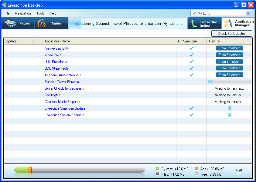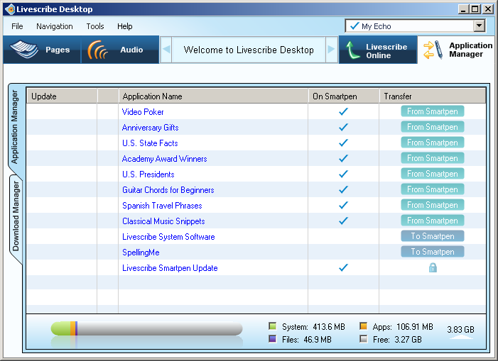 The Download Manager is for viewing apps you have downloaded from Livescribe Online, including software updates and apps your have purchased from the Livescribe Online Store.