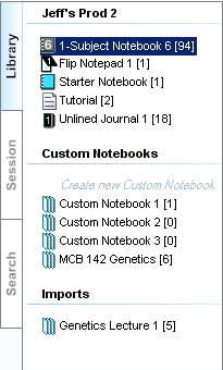 This tab shows your entire library of notebooks, journals, and other paper products you have used with your smartpen. Use the Library tab to select which notebook you want to view in the Central Viewing Pane. The Library Tab lists your physical notebooks, custom notebooks, and notebooks you have imported as pencasts.